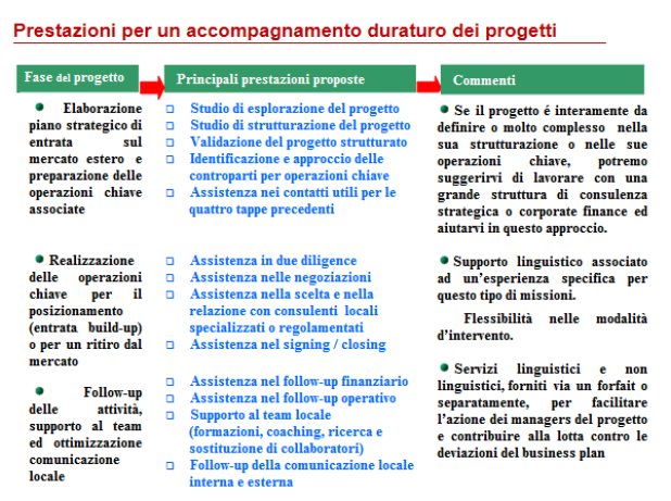 Possiamo intervenire su tutte queste componenti con dei servizi linguistici e non linguistici, forniti via un forfait o separatamente, per facilitare l’azione dei managers del progetto e contribuire alla lotta contro le deviazioni del business plan